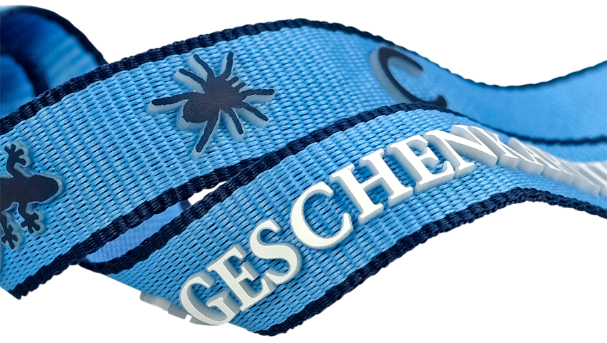 Using 3D printing a logo or design stands out clearly from the lanyard making your message not only easily visible but also interesting to the touch. Especially in high-contrast scenes this effect attracts attention. The surface of the printing can be designed in more than one color. We can also use this printing effect on other materials like felt.