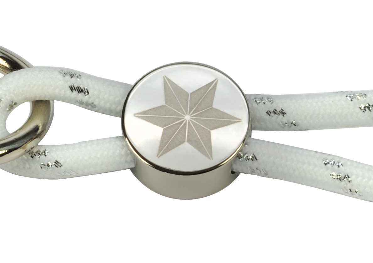The elegant, fine-textured cords with a round metal slider have a material thickness of 6 mm. The logo on the metal slider can be applied by laser engraving. Give your keychain the perfect shine by choosing to weave in glitter yarn. This is available in many different standard colors. Feel free to tell us your desired color.